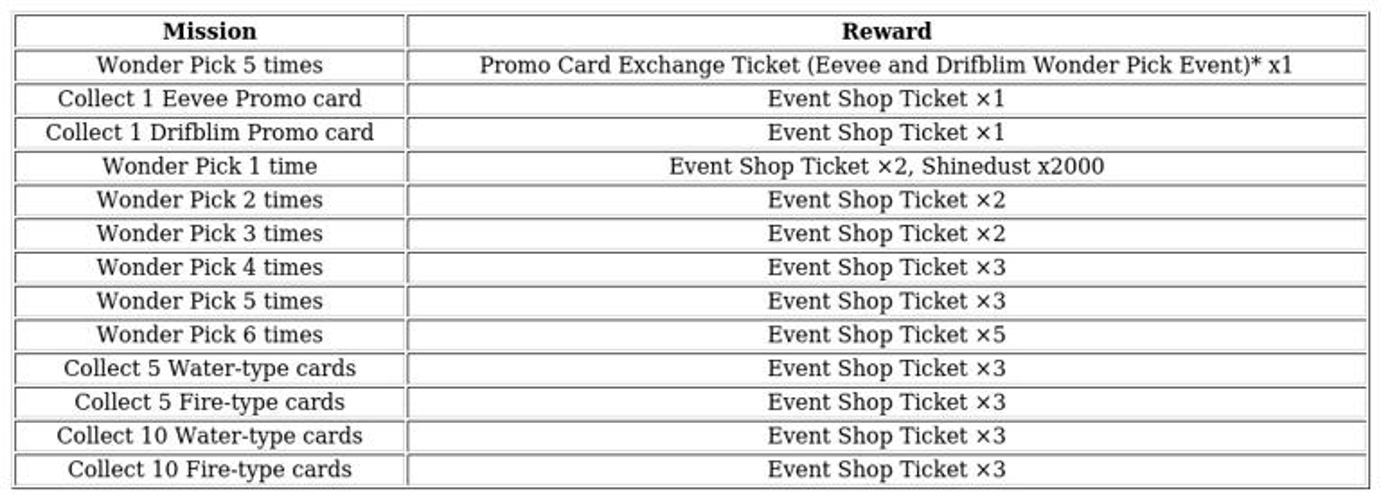 Players can obtain bonus picks in four different sets of rewards: one Mega Rising Eevee card plus two event tickets; one Eevee promo card plus two event tickets and two wonder stamina; one Mega Rising Drifblim card plus two event tickets and two wonder stamina; or one Drifblim promo card plus two event tickets and two wonder stamina.