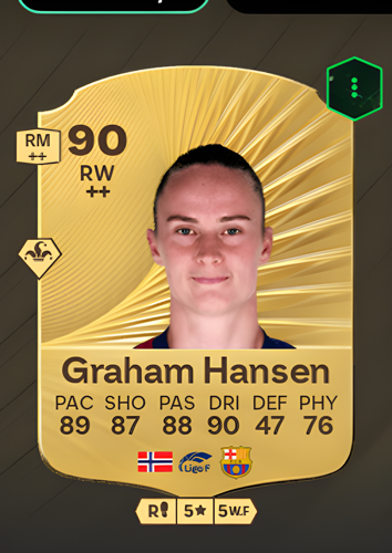 Caroline Graham Hansen's Gold Rare card stands out as a premier Right Wing option, boasting an impressive overall rating of 90. With a remarkable blend of 89 pace, 87 shooting, 88 passing, and an outstanding 90 dribbling, this card is designed for players seeking a dynamic and sharp attacking presence on the flank. As a winger, Hansen’s agility and technical skill allow her to swiftly break down defenses, create scoring opportunities, and make decisive contributions in crucial moments, making her an invaluable asset for any squad aiming to dominate the opposition.