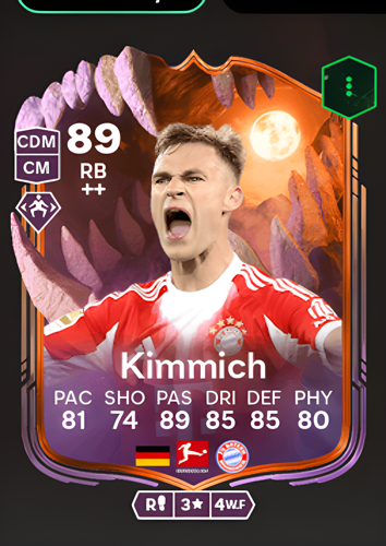 Joshua Kimmich's Ultimate Scream card features the German dynamo as a Right Back, boasting an impressive overall rating of 89. His standout attributes include an 89 passing rating and 85 ratings in both dribbling and defense, complemented by solid physicality (80) and pace (81). As a full-back, Kimmich’s primary advantage lies in his exceptional ability to dictate play from deep areas. His pinpoint passing and composed dribbling make him a potent playmaker, capable of launching precise attacks and seamlessly transitioning defense into offense. While his shooting is adequate (74), it's his defensive intelligence and relentless energy that allow him to shut down opposition wingers and support the midfield, providing crucial balance to any squad.