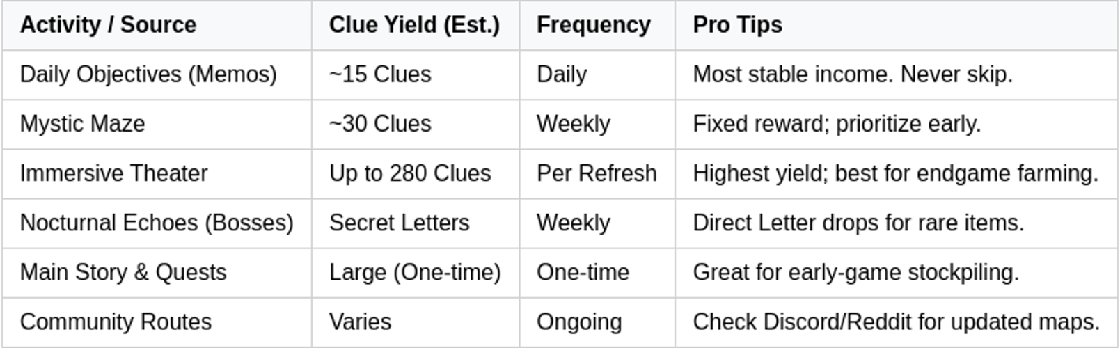 A practical approach involves daily and weekly routines. Completing daily memos, clearing the weekly mystic maze, and participating in the immersive theater can yield approximately 300 to 350 clues each day. Recent patches have increased drop rates in certain modes like immersive theater and nocturnal echoes, making farming more fruitful.