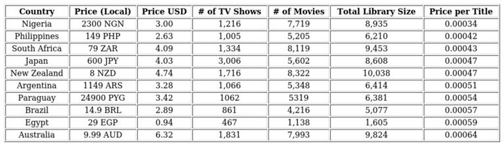 • South Africa: monthly fee $4.09, 9,453 titles, cost per title ≈ $0.00043.